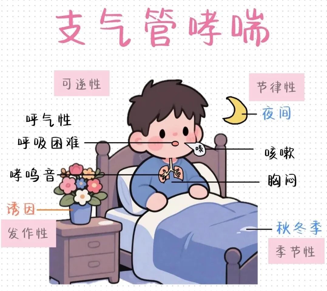 症状反复出现,与接触过敏原(花粉、尘螨)、冷空气、烟雾或运动有关。